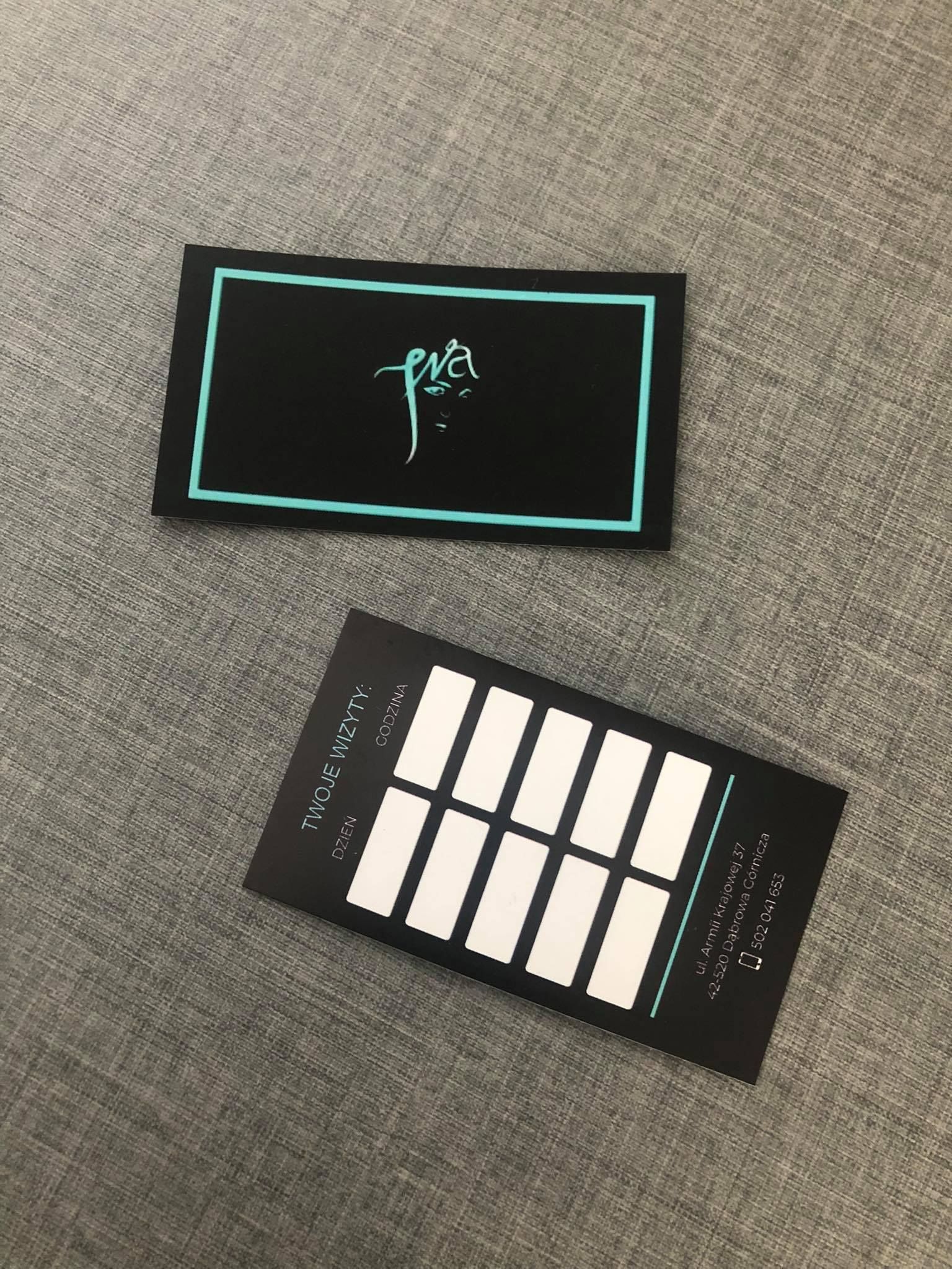 Klientka zdecydowała się również na wykonanie wizytówek z terminarzem wizyt, tak aby móc zostawiać klientom papierową formę umówionych wizyt.